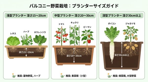 野菜の種類に合わせた適切な深さのプランターを選ぶことが、生育を促す上で最も重要です。