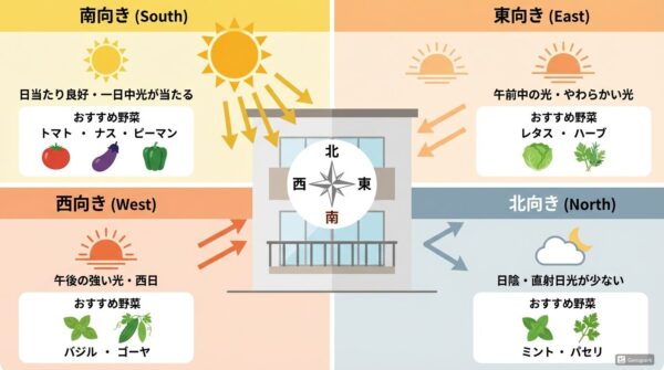 方角によって日照時間や日差しの強さが異なり、育ちやすい野菜が変わります。